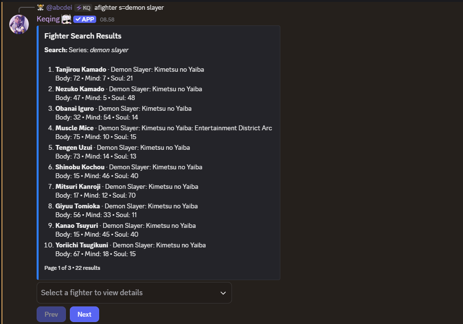 afighter # Show 100 most recent fighters afighter c:naruto # Search by character name afighter s:one piece # Search by series name