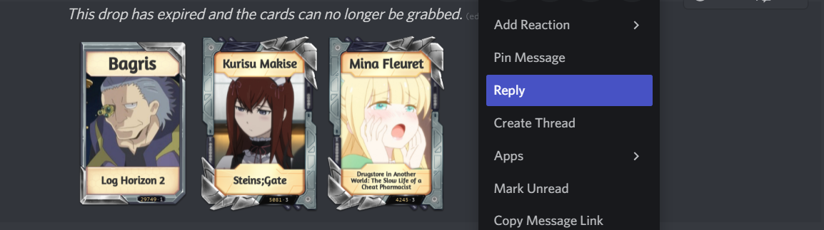 To star a drop message, simply reply to the Karuta drop with the