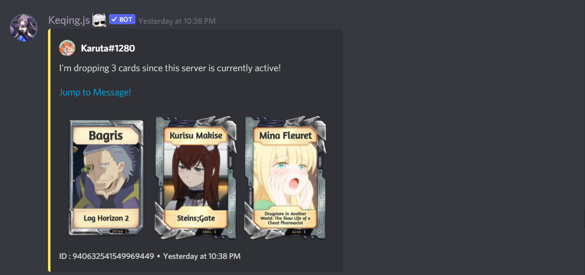 Display your best drops and other messages from Karuta.